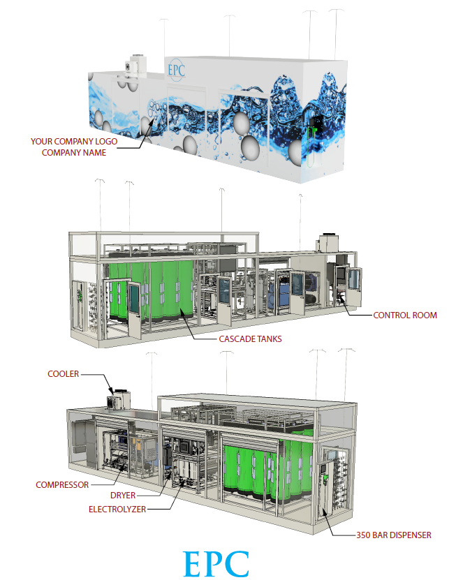 To deliver the 1000s of H2 fueling stations, hydrogen generation, fuel cell power generation backup power, and other H2 solutions EPC has developed unique H2 equipment packaging solutions. The key to scalability is modularity. Our solution is to integrate hydrogen generation, compression, storage and dispensing components into replicable cost-effective packages.